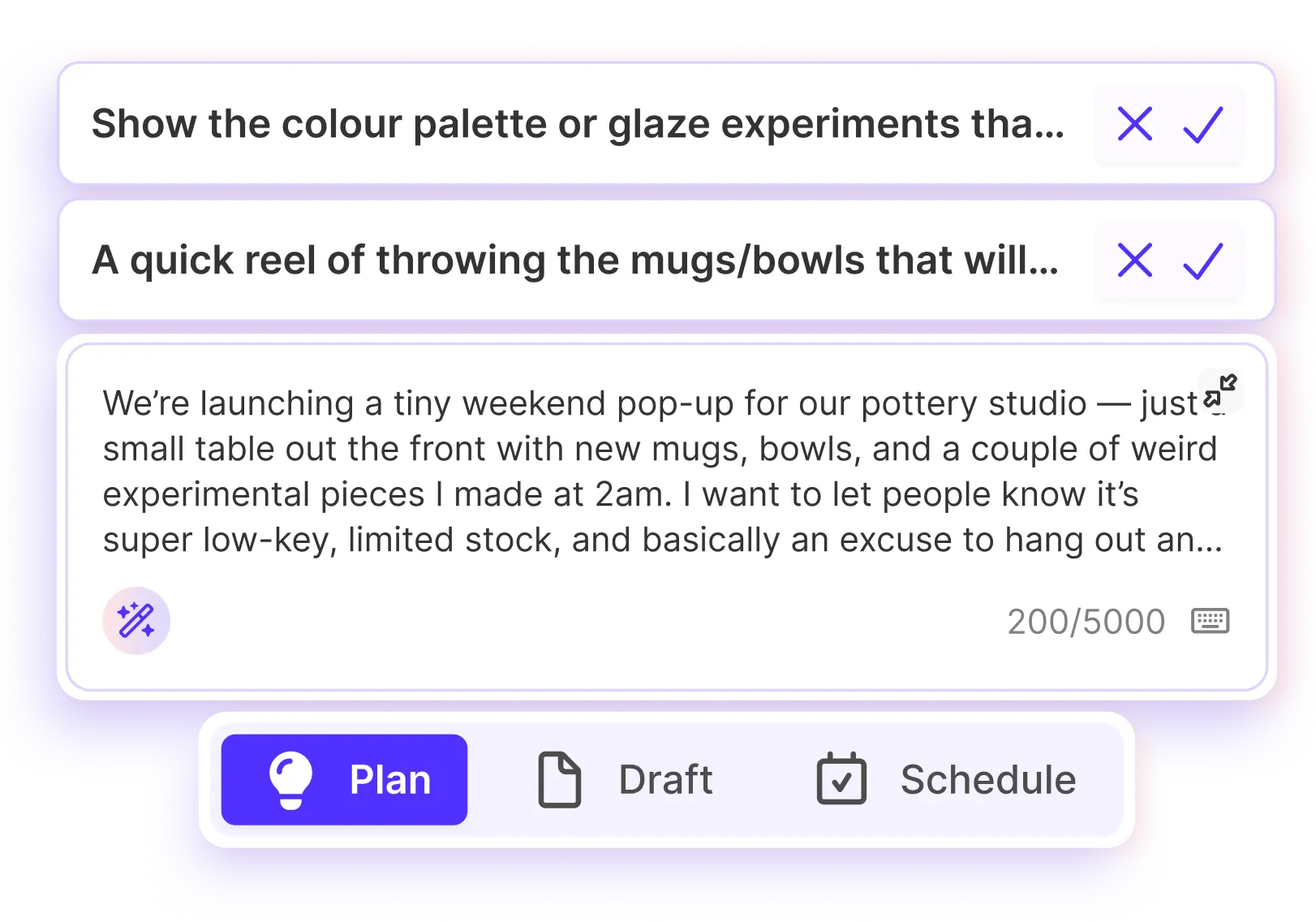 Your new all-in-one workspace where brainstorms actually turn into content. Capture ideas when they hit, work with your team, fill the gaps in your calendar, and let AI handle the heavy lifting—from concept to publish. Get early access today.